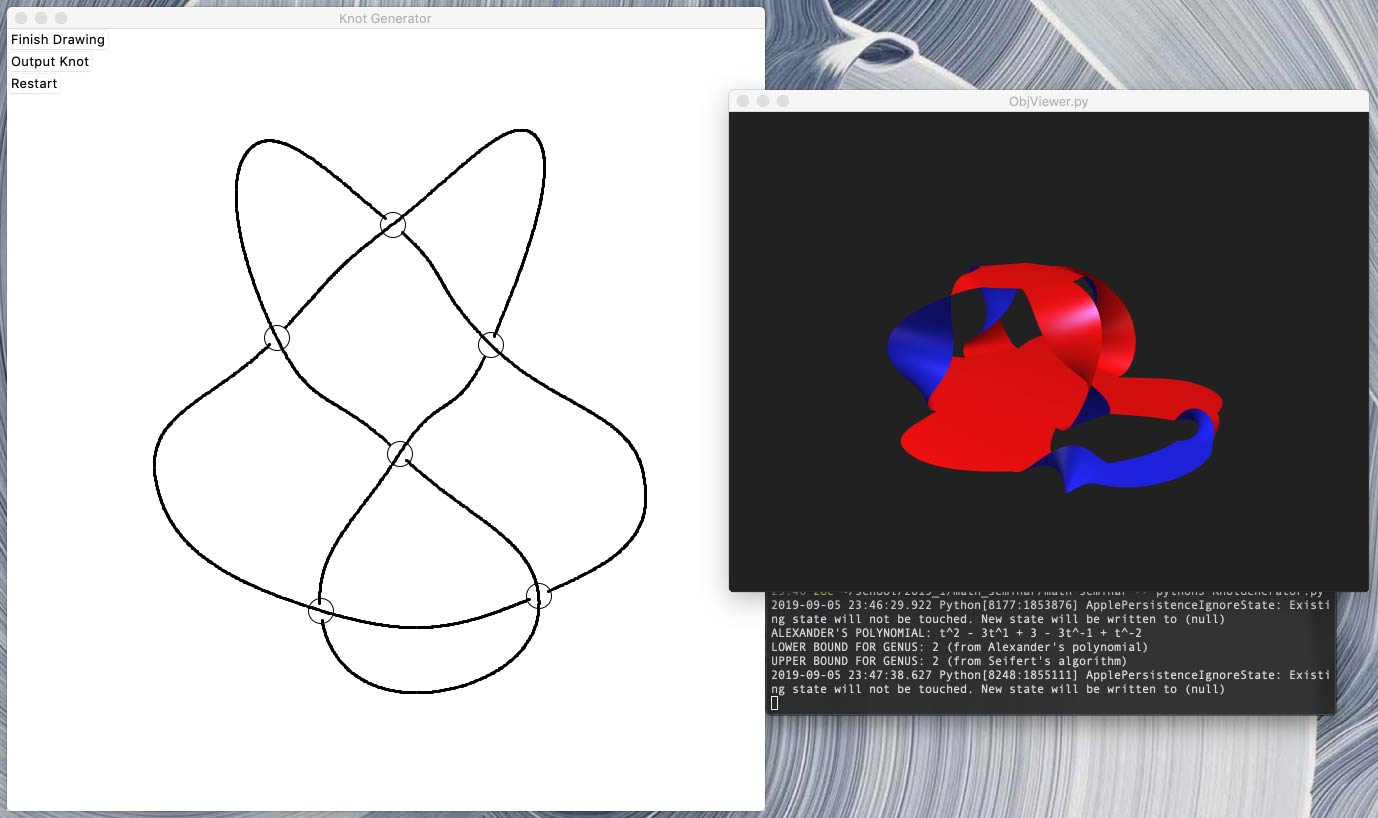As part of a group project for Ithaca High School/Cornell University math seminar, I created a program in Python which takes a graphical representation of a knot and computes the Seifert Surface, genus, and Alexander Polynomial of the knot.